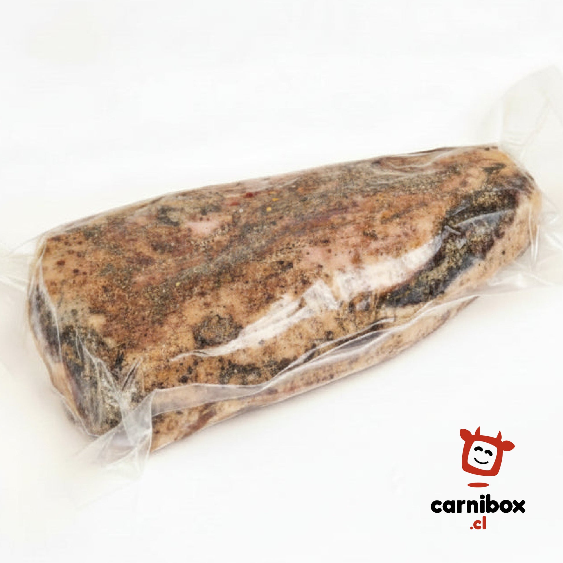 El Guanciale es un embutido tradicional italiano elaborado a partir de la mejilla o papada del cerdo, una de las partes más sabrosas y grasas del animal. Su nombre proviene de "guancia", que significa mejilla en italiano. Se cura cuidadosamente con sal y especias (generalmente pimienta negra, pimienta roja, ajo, romero o salvia), en un proceso artesanal que resalta su sabor intenso y profundo.
